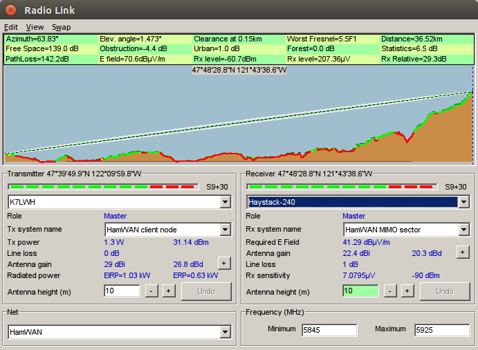 That's no good. Here's the link prediction from my last message plotted in Google Earth. Looks like the water tower blocks the shot to Haystack. Is that tower location correct? I've attached the .kml so you can see it in 3d. Snohomish County DEM (north) and Capitol Park (southwest) are also options. They're predicted at about -70 dBm. By the way, the coverage map is digital (coverage or no coverage). A red pixel indicates coverage better than -70 dBm. Anything less than that we don't plot. Any shading you're seeing is just how it's displayed--it's not indicating a different signal level. A signal level of -70 dBm will give you "full speed" on the network. The modem can maintain a connection down to about -88 dBm, but it won't be as fast. The map is conservative in that nothing between -70 and -88 dBm is plotted. Also keep in mind that the map doesn't know what trees or water towers exist around your property. (It does some primitive land cover adjustments, but I've found binoculars or Google Earth to be more accurate.) Tom