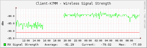 Dan, This is great! I did not expect your sector antenna to have such favorable improvement over the QRT-5. I hope the QRT-5 performs well in its new home. I am curious if a Poynting grid antenna could be aimed precisely enough from your tree mount to gain a few more dB. Here's how the improvement looks on the graph (the gap is the time it took for me to point the monitoring at your new IP address): https://monitoring.hamwan.k7nvh.com/cacti/graph_view.php?action=tree&tree_id... By the way, since adding SNMP graphing for your node, your link status is now noted on the coverage map.https://hamwan.org/t/Coverage+Map Tom KD7LXL