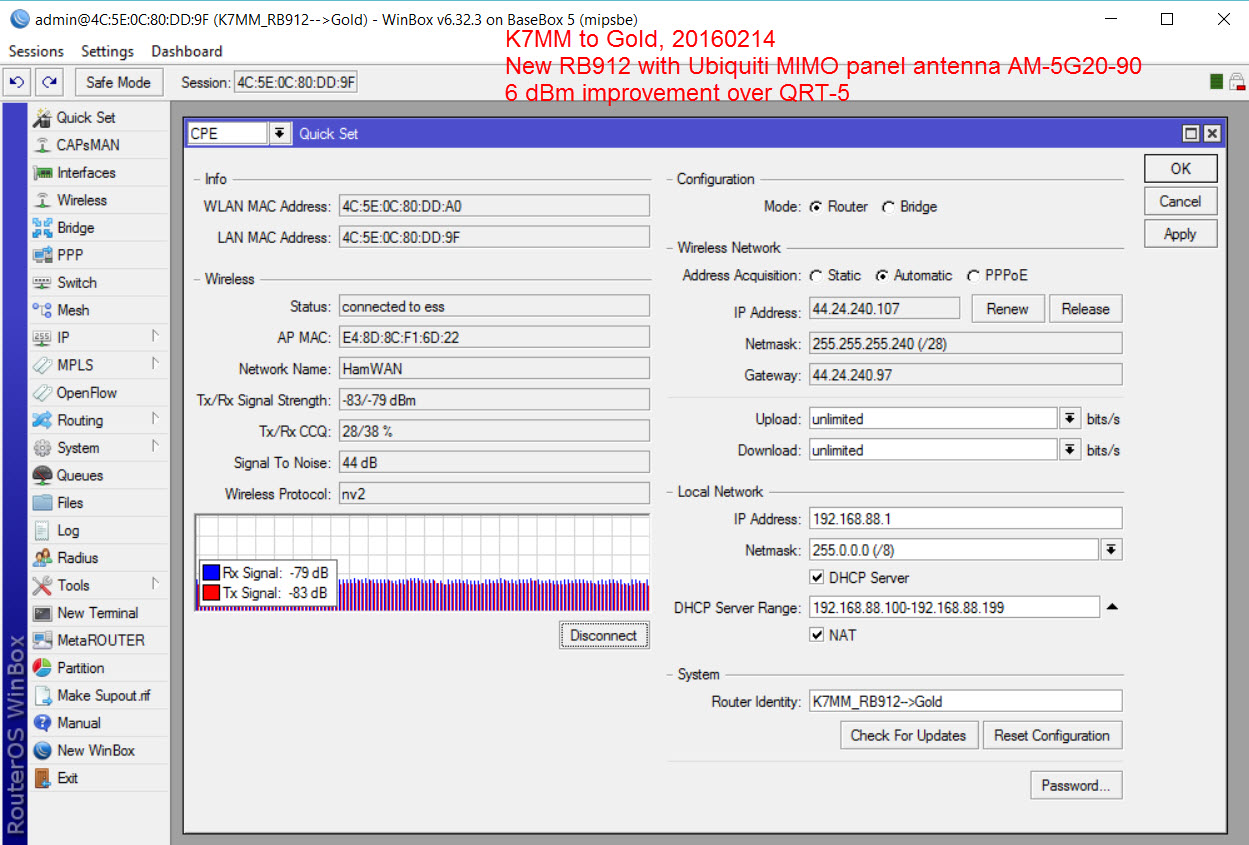 I installed the new MikroTik MIMO radio and Ubiquiti panel antenna in the tree mount at my backyard fence (where I have LOS to Gold Mountain). My signal is 6 dBm better, with increased signal-to-noise ratio, over the QRT-5. (The QRT-5 moves to the South Kitsap School District bus barn for Emcom use.) The panel antenna has a 2-degree downtilt for mounting on a high site. So, for my low-site location I turned it upside down. See photos. I have attached a Winbox capture.73 from Dan at K7MM