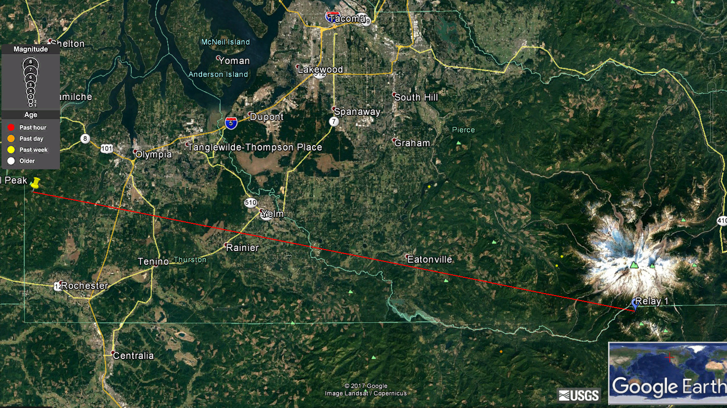 Here is one approach to see if you have even a little chance of connecting. Use Google Earth. First plot the location of Capitol Peak. The coordinates are 46.9730333, -123.1382166. Second, plot the coordinates of your location. Put a placemark at both locations. Now using the ruler tool draw a straight line between the two locations and save it. Then right click on that line and select elevation profile to see if you have line of sight. See attached screen captures (don't know if attachments will go through, I'll try). In the third attachment, you see the elevation profile for the path I was considering. It won't work because there is a much higher peak in between Capitol Peak and the location I was interested in (Inspiration Point on the side of Mount Rainer). The arrow shows where that peak is along the path, and the elevation profile shows that isn't the only obstruction, there are a few other peaks also in the way. Another elevation profile attached is from my house in NW Seattle to Gold Mtn. On that you can see that there is clearly a good path, no obstructions along the way. I just have to find a location on my lot that doesn't have trees blocking the view (which is its own challenge). Carl, N7KUW -----Original Message----- From: PSDR [mailto:psdr-bounces@hamwan.org] On Behalf Of Lee Chambers Sent: Sunday, August 27, 2017 10:23 AM To: Puget Sound Data Ring Subject: Re: [HamWAN PSDR] Node question Thanks. I'm pretty low, but just maybe there's a shot between the distant hills. What should I look for? Lee