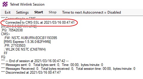 Testing CMS telnet connection to cms.winlink.org <http://cms.winlink.org> through port 8772... Successfully connected to a CMS through port 8772 in 253 Milliseconds