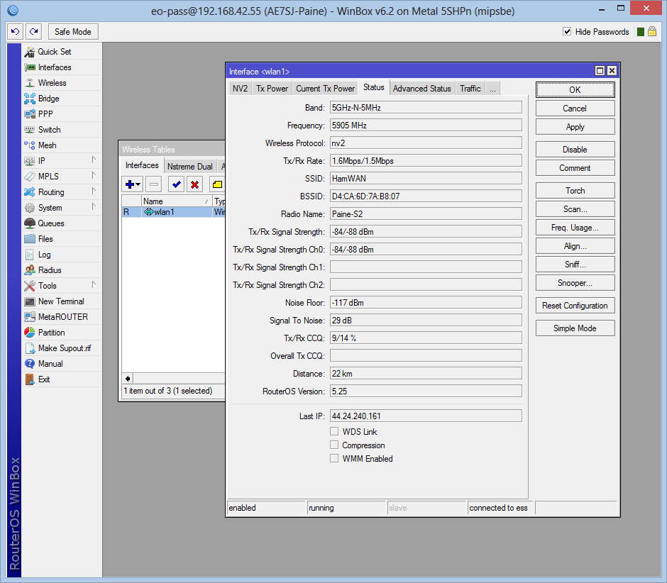 input does not match any value of name [eo@AE7SJ-Paine] /interface wireless> print Flags: X - disabled, R - running 0 R name="wlan1" mtu=1500 mac-address=D4:CA:6D:7A:B8:23 arp=enabled interface-type=Atheros AR92xx mode=station ssid="HamWAN" frequency=5905 band=5ghz-onlyn channel-width=5mhz scan-list=5905 wireless-protocol=nv2 wds-mode=disabled wds-default-bridge=none wds-ignore-ssid=no bridge-mode=enabled default-authentication=yes default-forwarding=yes default-ap-tx-limit=0 default-client-tx-limit=0 hide-ssid=no security-profile=default compression=no