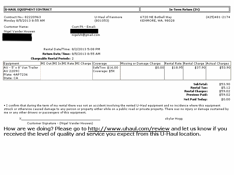 As part of the deployment work at Baldi, I rented and paid for a small utility trailer for the sole purpose of getting equipment up to the site at Baldi. If possible, I would like the money I put towards this effort to be considered a donation to the group in my name. Image of receipt provided by U-Haul is attached.