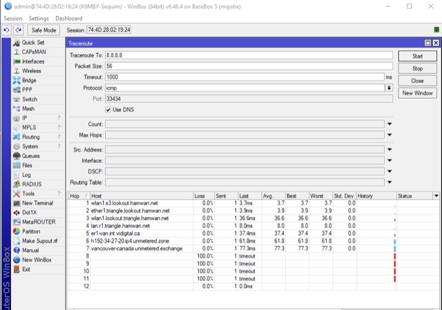 Looks like our upstream ISP in Vancouver BC may have enabled source address filtering, Let me have a look. Right now traffic from Lookout hops over to Triangle and then tunnels out to Vancouver and hops out to the Internet from there. Chris On 13/07/2020 13:30, Bob Sampson wrote: