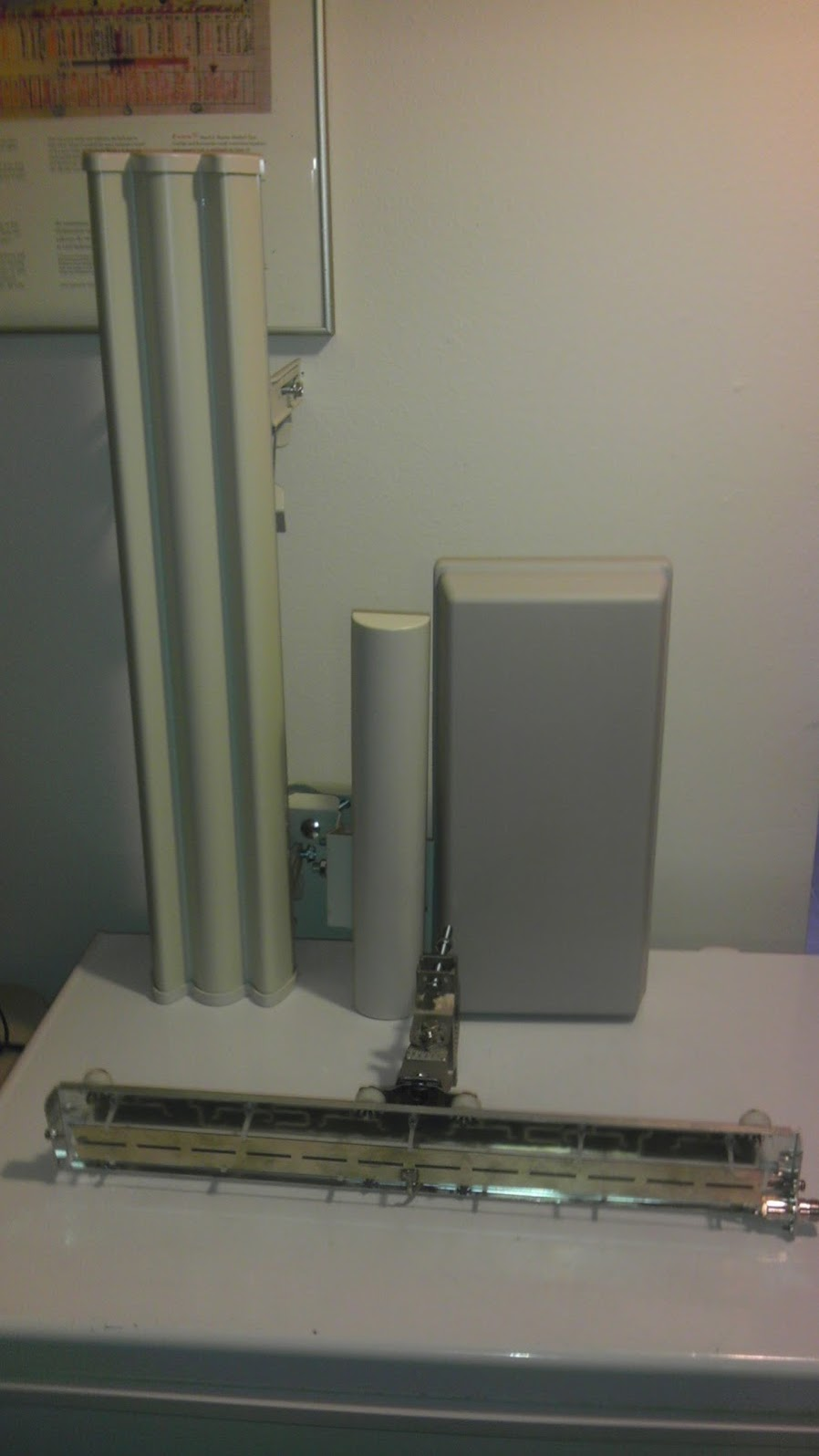 From left->right we have: Ubiquiti AirMax 5G-19-120, Ubiquiti AirMax 5G-16-120, ARC Wireless ARC-VS5818SD1. Then laying on the bottom we have the Laird SAH58-120-16-WB, shown without radome cover. The Ubiquiti antennas will go on the antenna test range shortly. Just an interesting size comparison. --Bart